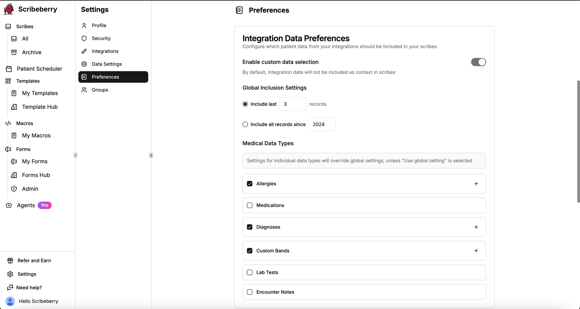 - Custom bands: Pull Allergies, Diagnoses, Medications, Encounter Notes, Custom Bands, and Labs from Accuro into Scribeberry for use as context in the visit.