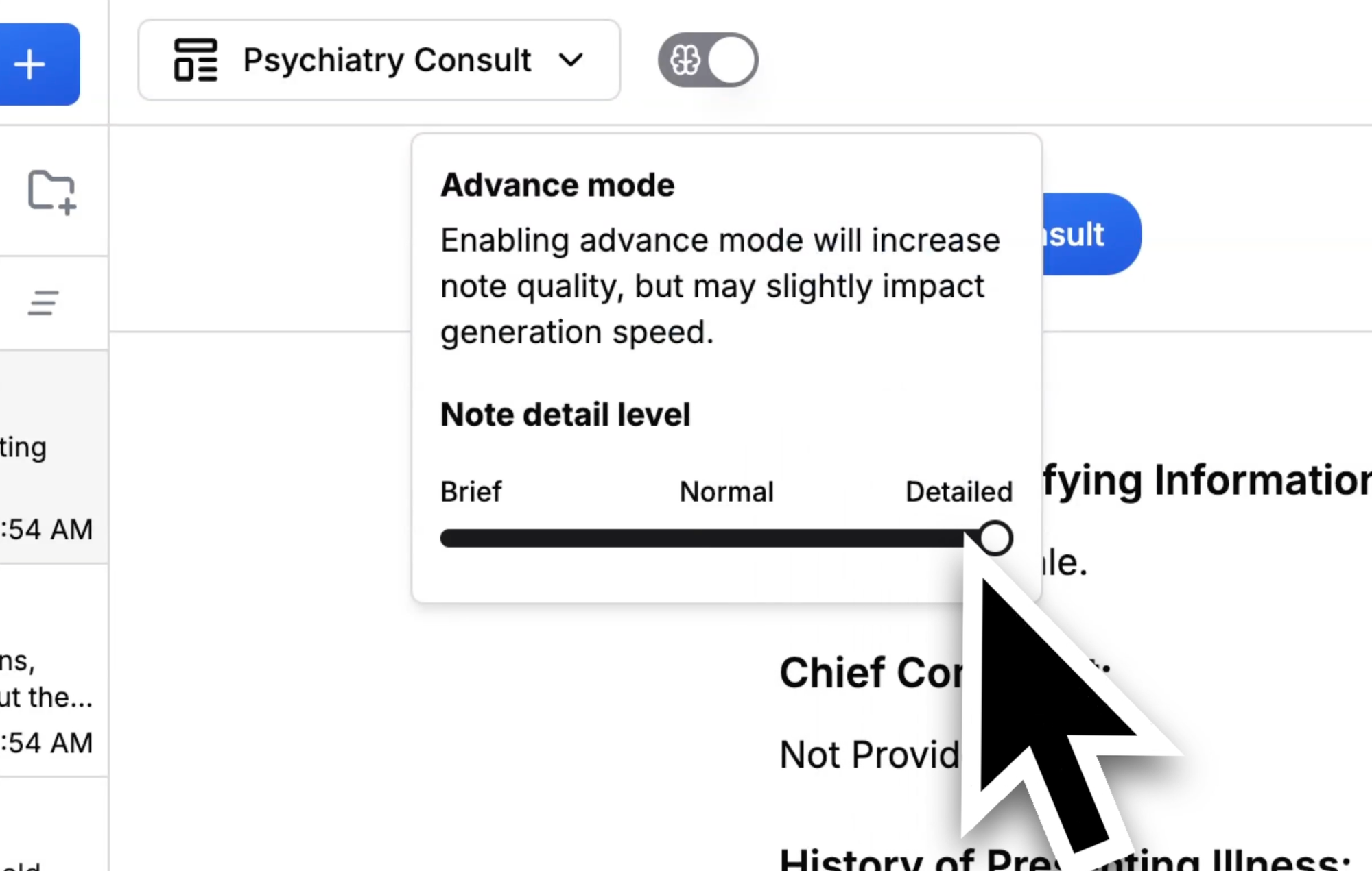 Based on invaluable feedback from psychiatrists, developmental pediatricians, geriatricians, and other specialists who require detailed documentation, we've developed an Advanced Mode. This feature empowers you to create comprehensive, multi-page consults without missing crucial details.