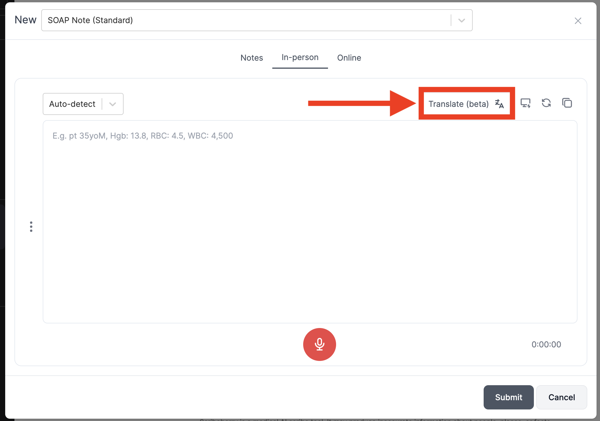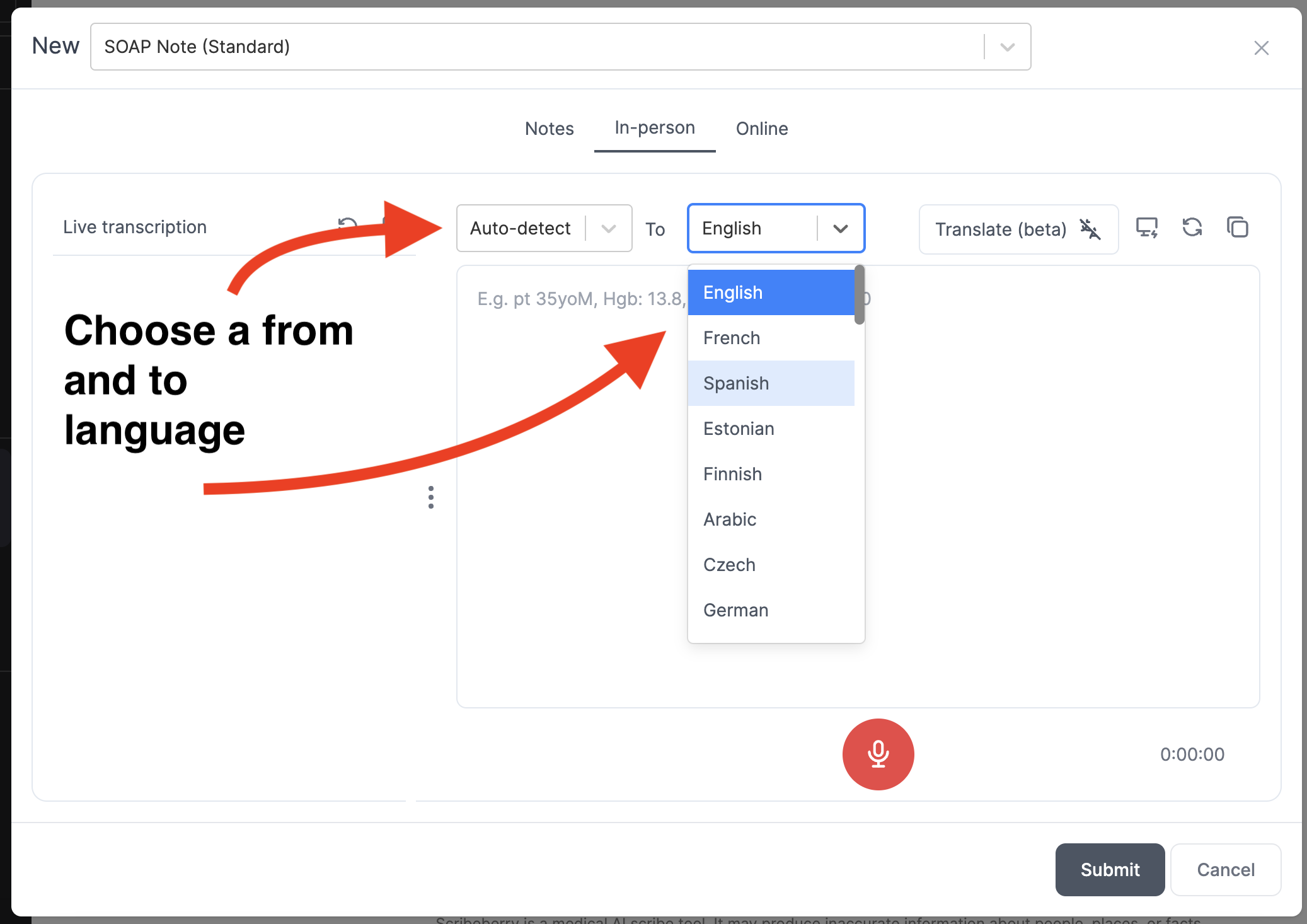 When you begin your next consult, just click the Translate (beta) button. Choose your from and to languages. It's typically ideal to select Autodetect as your from language. When your patient starts speaking in their native language, Scribeberry will instantly translate their words and display them on your screen. It's like having a personal interpreter right there in the room with you, minus the expensive hourly rate.