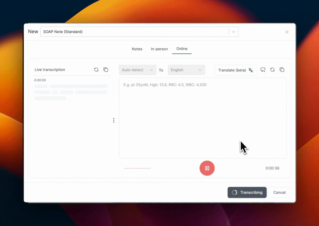 Basically, you pick a (spoken) language or just let Scribeberry autodetect it and then you choose a translate to language. From there, Scribeberry will automatically translate the conversation live during your consults. This feature is especially helpful for patients who don't speak the same language as you or who have caregivers.